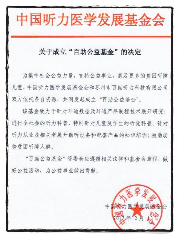 成立“中國聽力醫(yī)學(xué)發(fā)展基金會(huì)百助公益基金”(以下簡(jiǎn)稱百助公益基金)。