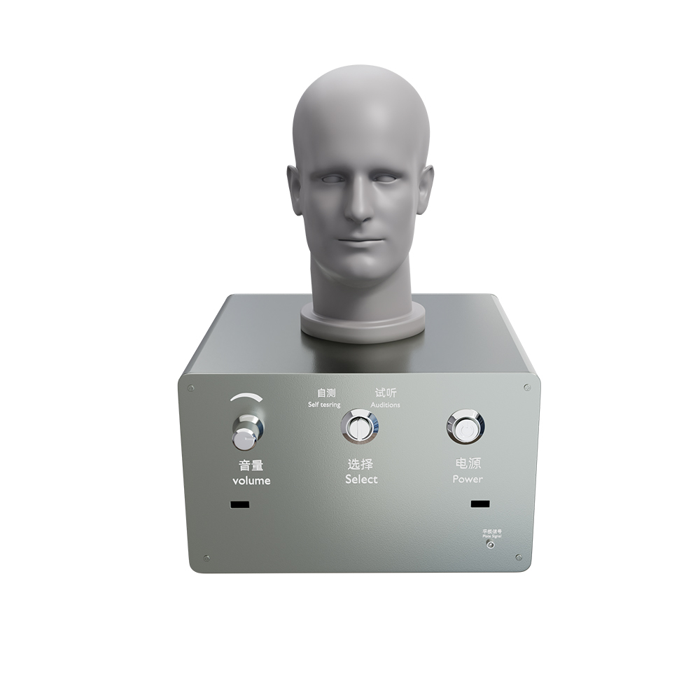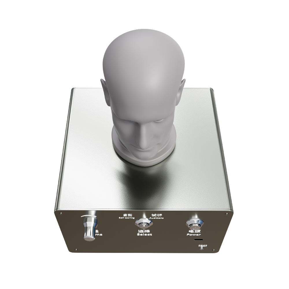 助聽器效果演示一體機,使用時可置放操作桌上。人頭模型兩耳位置設(shè)有通孔,耳背機或盒式機的聲管由此導(dǎo)入與導(dǎo)聲管相接。